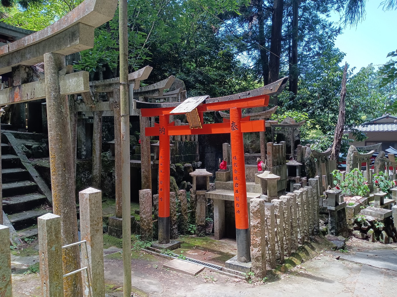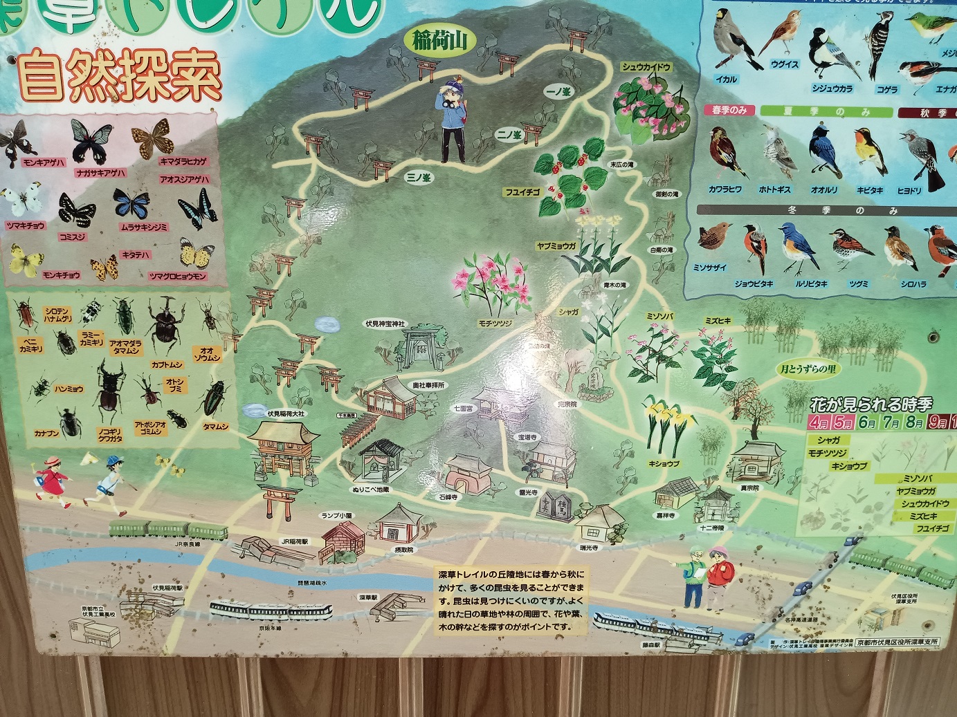 伏見稲荷の現地案内図と青木の滝の写真です。 地図に電車の絵が有りますが、一般の人はここから登り、 有名な千本鳥居をくぐって地図の左へ進み、三ノ峯と書かれた 左手の四つ辻に出ます。